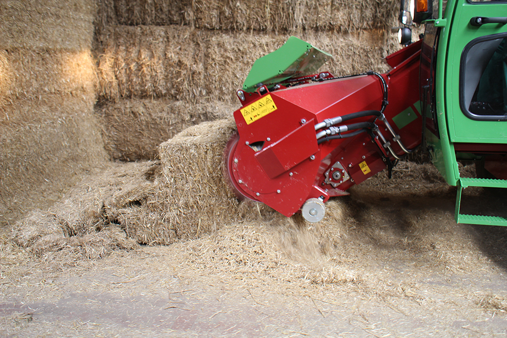 Two manually adjustable counter-cutters enable the processing of larger quantities of long-fibre fodder such as round and square bales.